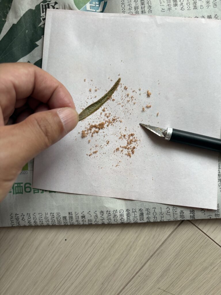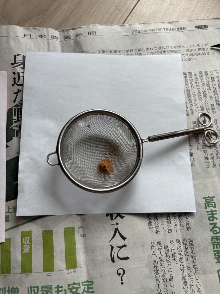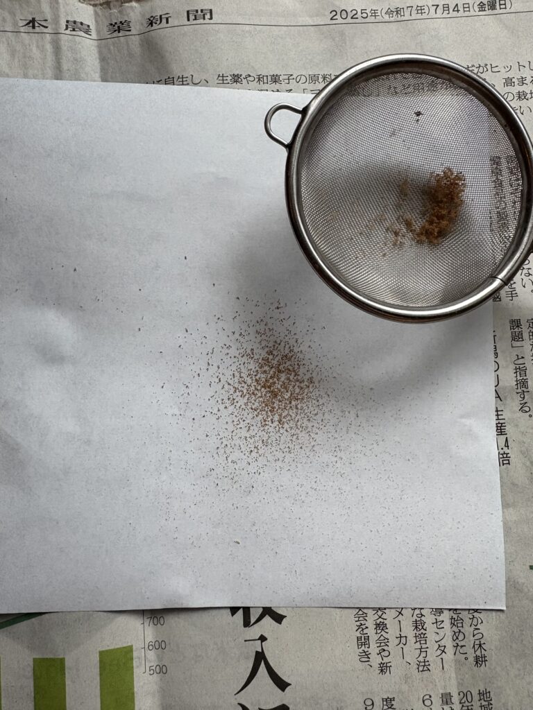 モケモケの胞子を全て茶こしに移し、再度白い紙の上にふるいにかけると胞子のみが下に落ちますのでこれで胞子を蒔く準備完了となります!