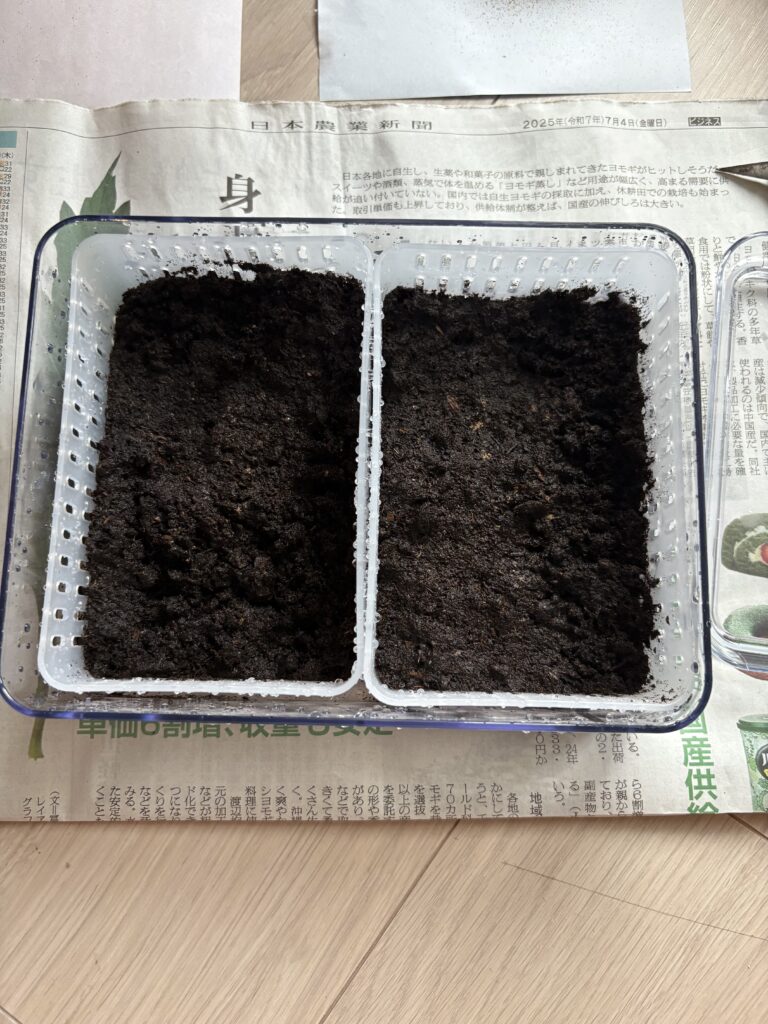 今回は3COINSで500円で購入したタッパーにジフィーの種まきミックスを敷いています。